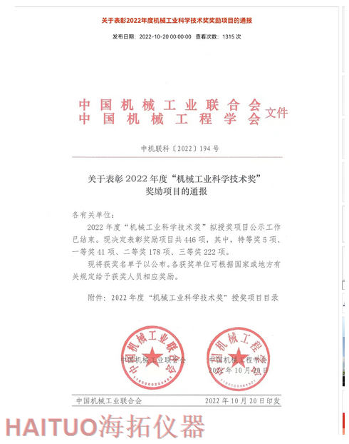 海拓儀器榮獲2022年度中國機械工業(yè)科學(xué)技術(shù)獎?ICC訊?10月20日,2022年度“中國機械工業(yè)科學(xué)技術(shù)獎”項目名錄正式發(fā)布,由海拓儀器(江蘇)有限公司完成的“超快速冷熱沖擊試驗系統(tǒng)關(guān)鍵技術(shù)研究與系列應(yīng)用”項目榮獲2022年度“中國機械工業(yè)科學(xué)技術(shù)獎”三等獎。??據(jù)了解,中國機械工業(yè)科學(xué)技術(shù)獎是根據(jù)《國家科學(xué)技術(shù)獎勵條例》和《社會力量設(shè)立科學(xué)技術(shù)獎管理辦法》的有關(guān)規(guī)定,由中國機械工業(yè)聯(lián)合會和中國機械工程學(xué)會共同設(shè)立并經(jīng)國家科學(xué)技術(shù)部批準(zhǔn),在國家科技獎勵主管部門登記的面向全國機械行業(yè)的綜合性科技獎項。旨在表彰在機械工業(yè)科技工作中作出突出貢獻的單位和人員,獎勵范圍包括:機械工業(yè)科學(xué)技術(shù)發(fā)明成果、機械工業(yè)科學(xué)技術(shù)進步成果、機械工業(yè)工程化和新技術(shù)推廣成果和機械工業(yè)軟科學(xué)和標(biāo)準(zhǔn)成果。??海拓儀器是一家集研發(fā)、制造、貿(mào)易于一體高科技現(xiàn)代化公司,公司成立于2005年,主要產(chǎn)品包括:超快速冷熱沖擊試驗機(熱流儀)、快速溫變應(yīng)力篩選試驗箱(ESS), -
